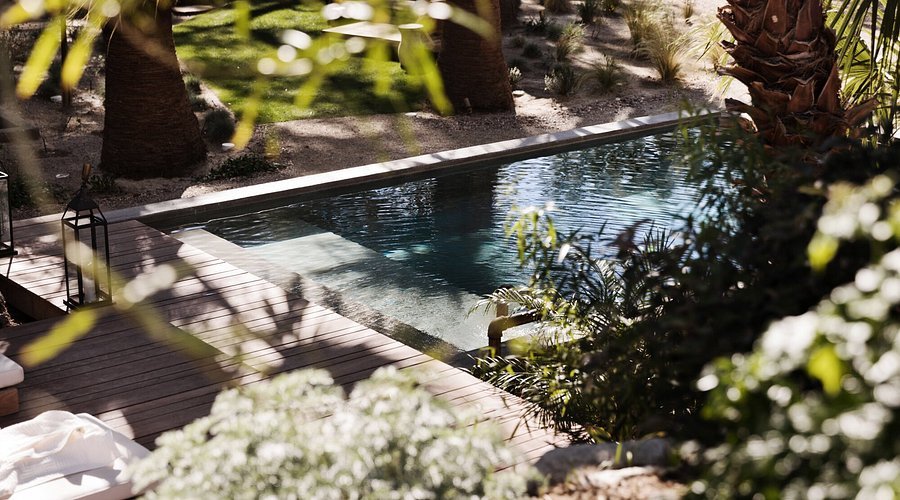 • A lush, meditative oasis surrounded by palms, desert flora, and soft, natural textures.